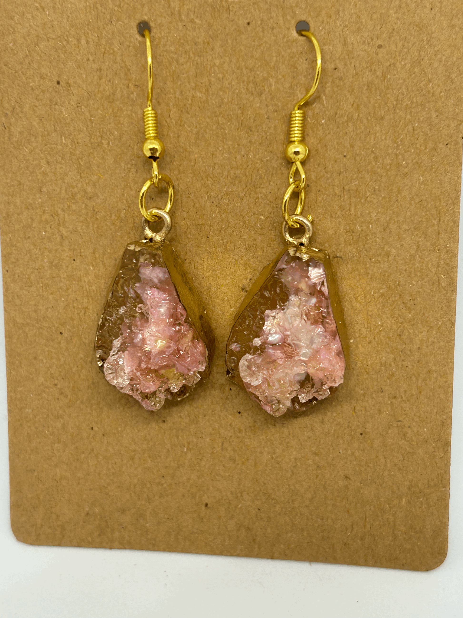 Delicate blush geode with gold wrapping, elegant & sophisticated. Suspended from gold hooks, nature's beauty with a touch of luxury. Versatile statement for your collection.