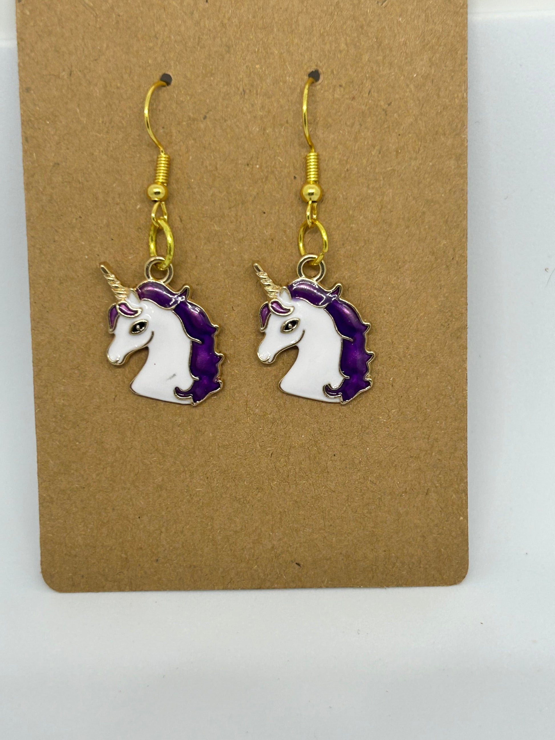 Discover our mystical unicorn head earrings in purple and white, adding magic to your outfit for any occasion. Embrace your unique style with these whimsical accessories!