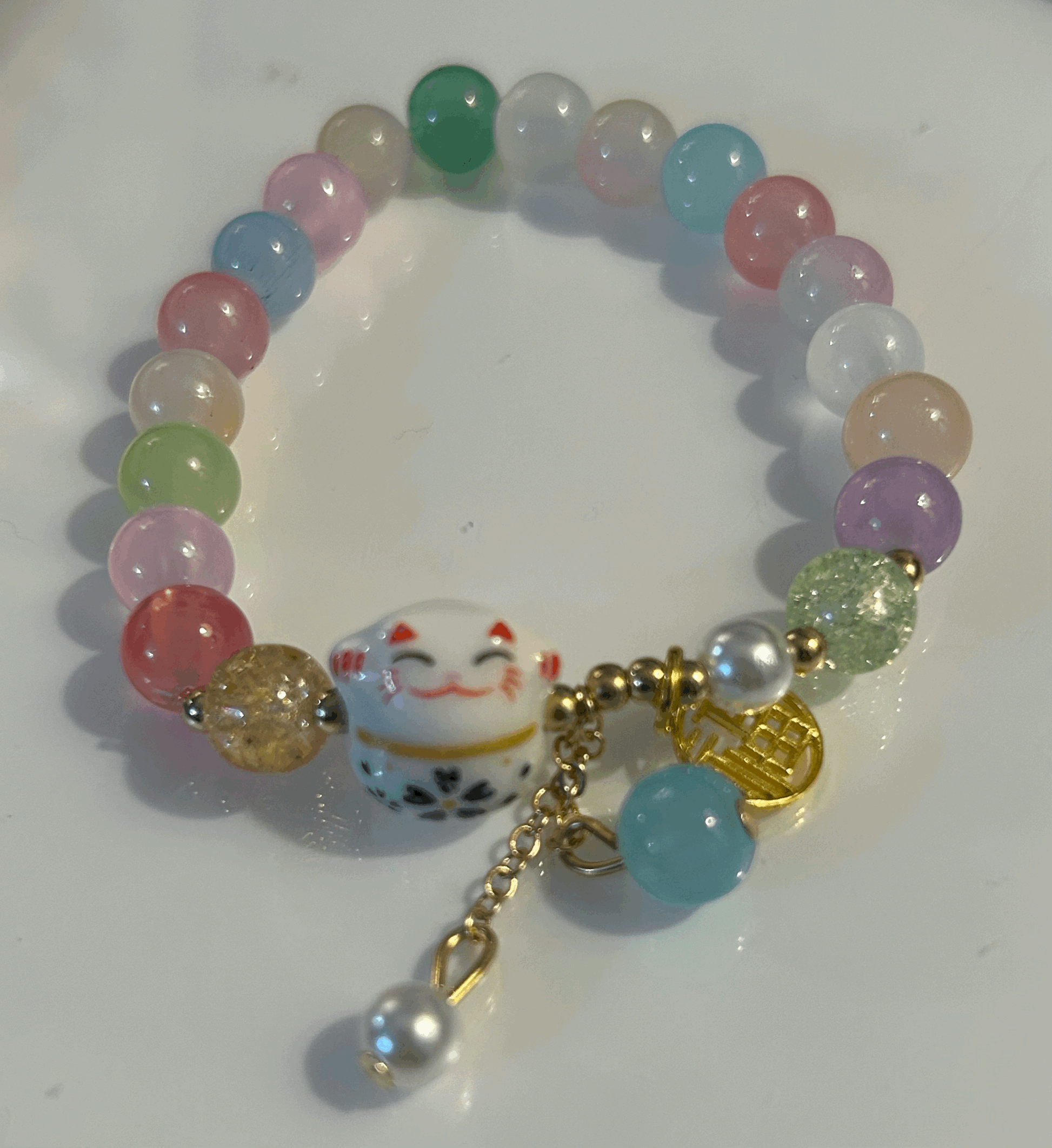 Multi-Colored Glass Bead Bracelet with Lucky Cat Charm