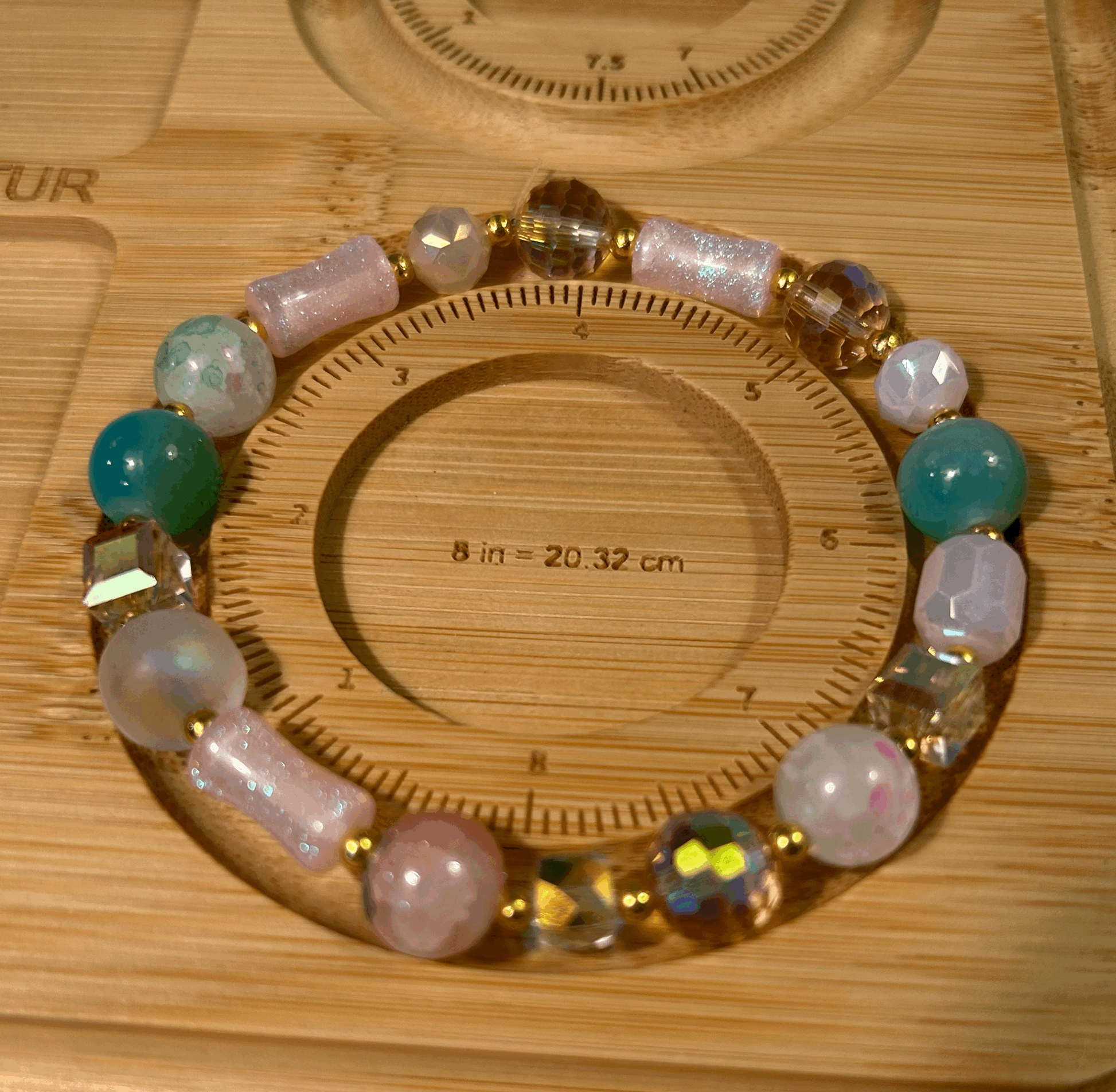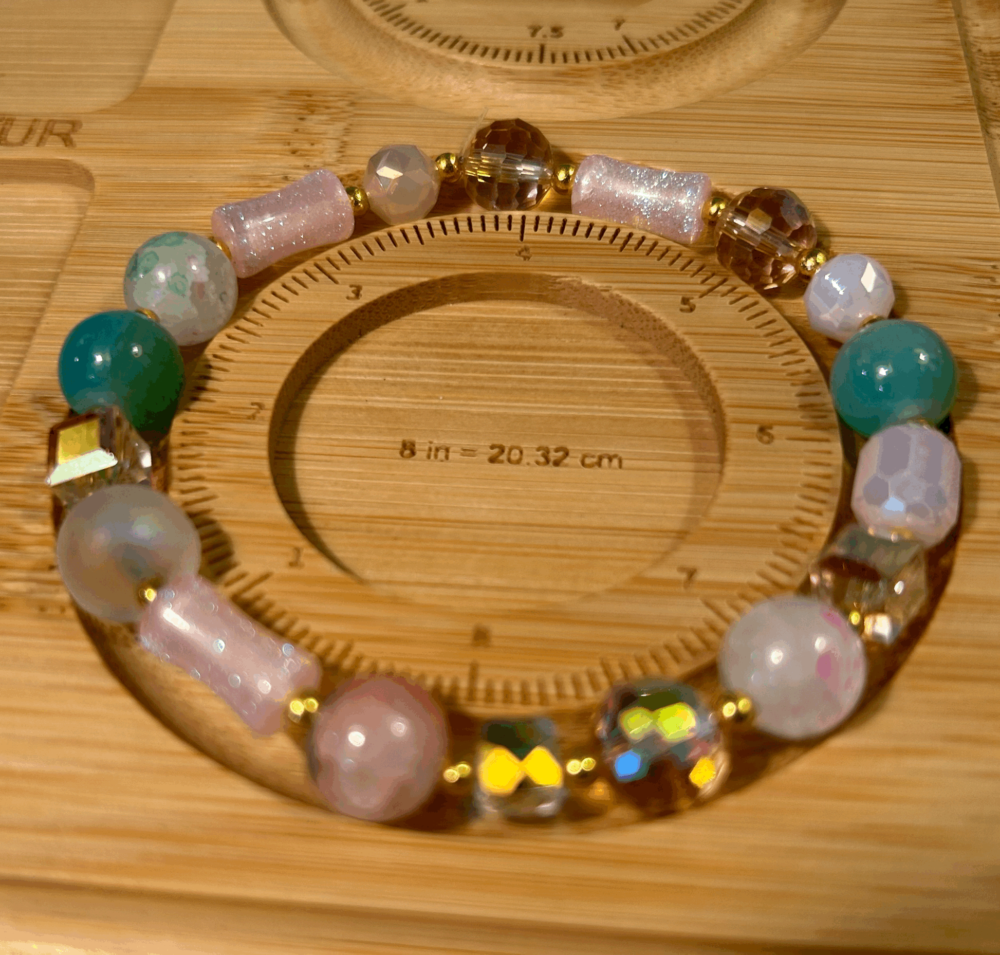 Enhance your style with our pink and green glass bead bracelet. Stretchy for all wrist sizes. Wear alone or layer for a trendy look, perfect for any occasion. A versatile and sophisticated addition to your jewelry collection.